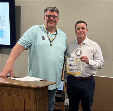 Rotarians are always welcome to attend any other club's meeting any where in the world. A tradition of Rotary is to exchange club banners when visiting another club. Steve SchraderBachar attended the noon Rotary Club of Ames on August 19th and traded one of our Club's banners for one of theirs. He presented it to President Patterson during our meeting on August 20th. If any member is planning to attend another club's meeting and would like to exchange a banner with them, the club's banners are available and kept in a box in the storage room at the Ankeny Golf & Country Club.