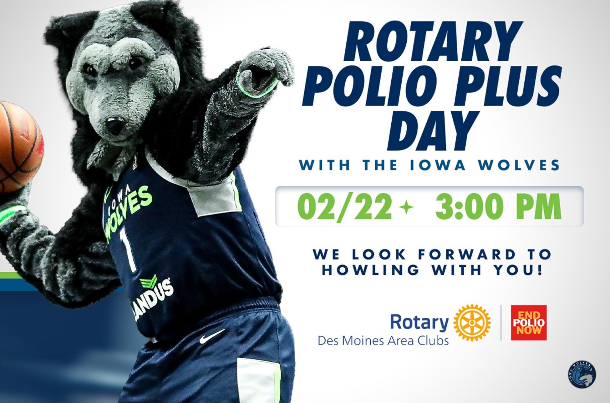 Join your fellow Rotarians for an unforgettable day of basketball and giving back at the annual "Rotary Polio Plus Night" with the Iowa Wolves at the Casey's Center on Sunday February 22 at 3:00 PM. It will include the excitement of State Fair Day, complete with a delightful petting zoo featuring goats, cows, and a charming donkey and the opportunity to dive into the fun of carnival games and showcase your creativity with butter sculpting!
